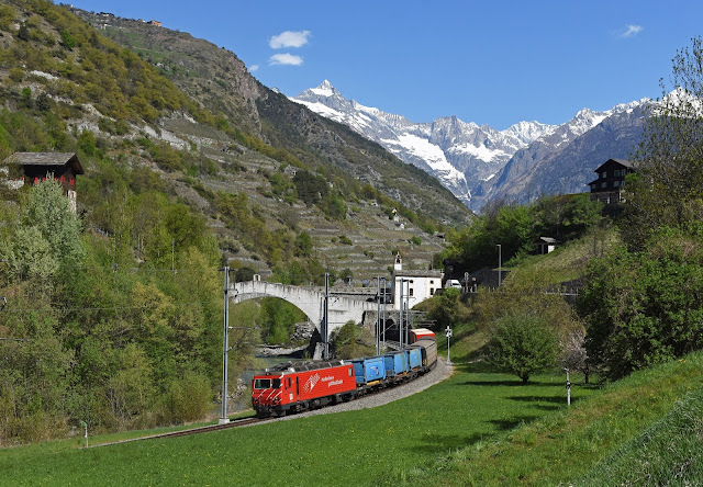 | One of the shots of the trip- MGB meter gauge HGe4/4ii 5 'MOUNT FUJI' leads the midday freight from Visp to Zermatt at Neubrück. 28/04/22 |
